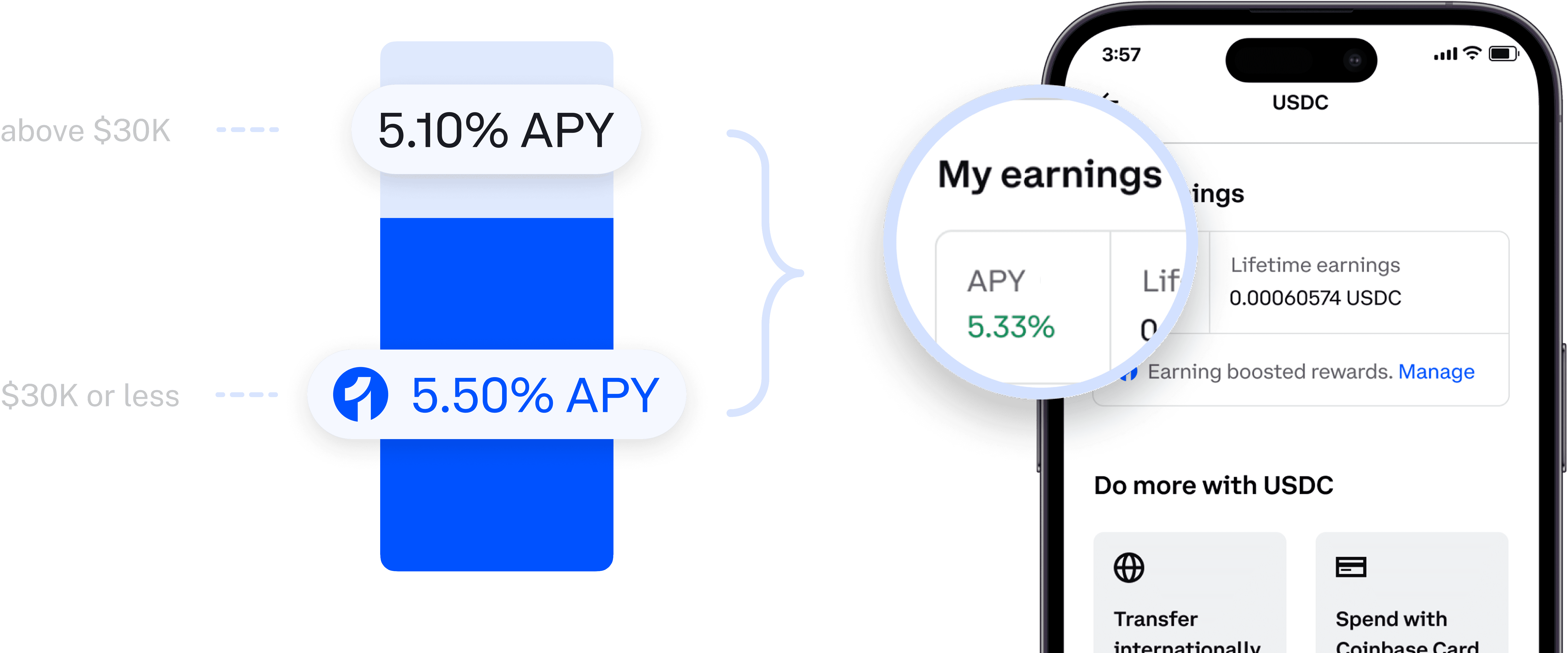 USDC Rewards is Coinbase's top growth lever, offering interest-like incentives for users holding USD Coin. Coinbase One members earned 5.50% APY on their first $30K of USDC, and 5.10% after that. But users only saw a single rate - often something like 5.33% - with no context or breakdown.