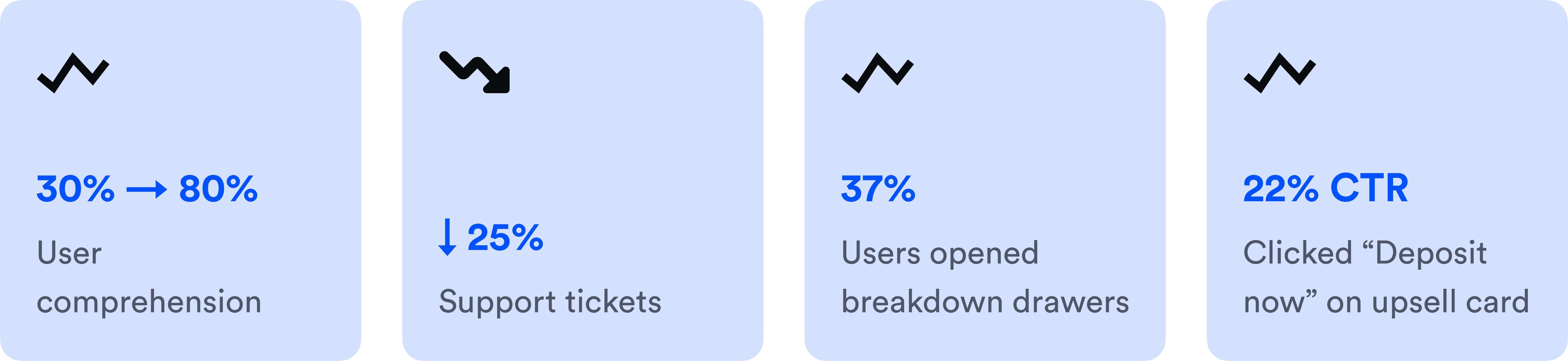 Improving APY comprehension directly reduced user confusion and support load, while the upsell card and breakdown drawer drove meaningful engagement. These results validated that designing for clarity first unlocked better user trust and platform growth.